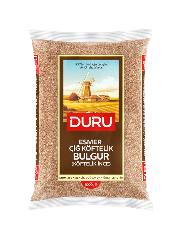 Duru Esmer Çiğ Köftelik İnce Bulgur, doğal taş değirmen teknolojisiyle üretilir ve kepekli yapısı sayesinde lif, bitkisel protein, mineral ve vitamin bakımından zengindir. Sarı bulgura göre daha yumuşak yapısı sayesinde çiğ köfte yapımında kolayca yoğrulabilir.