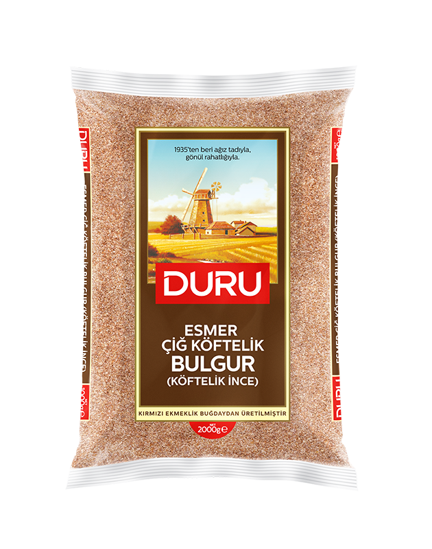 Duru Esmer Çiğ Köftelik İnce Bulgur, doğal taş değirmen teknolojisiyle üretilir ve kepekli yapısı sayesinde lif, bitkisel protein, mineral ve vitamin bakımından zengindir. Sarı bulgura göre daha yumuşak yapısı sayesinde çiğ köfte yapımında kolayca yoğrulabilir.