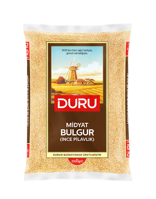 Duru Midyat Bulgur, doğal taş değirmen teknolojisiyle üretilir ve lif, bitkisel protein, mineral ve vitamin bakımından zengindir. Köftelik ve pilavlık bulgur arasında bir boyuta sahiptir, çorbalar, pilavlar ve salatalar için idealdir.