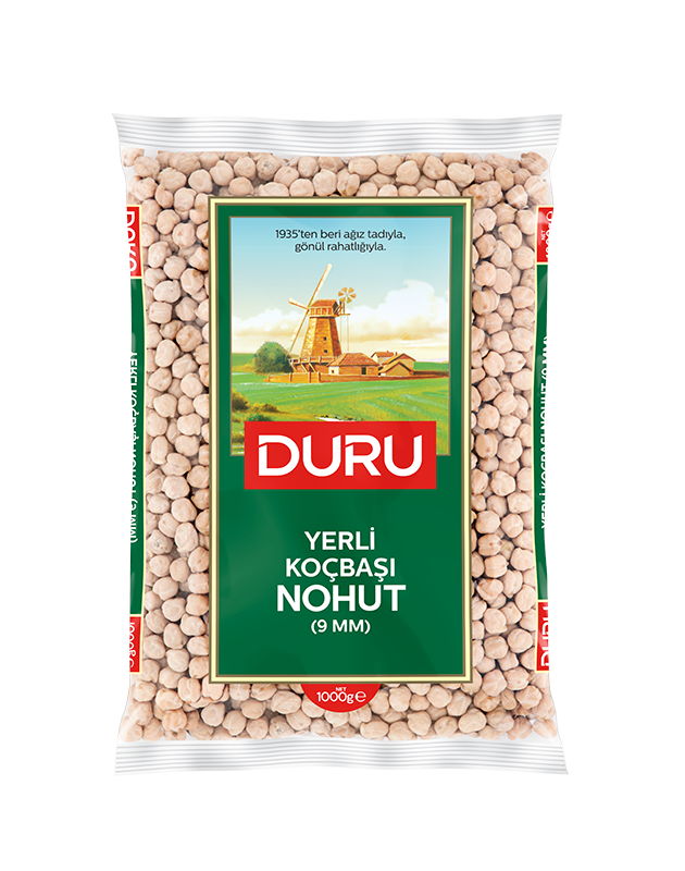 Duru Yerli Koçbaşı Nohut (9 mm), Karaman ve Konya yöresinin en kaliteli nohutları arasında yer alır ve kabuk bırakmama özelliği ile öne çıkar. Lif, bitkisel protein ve mineral bakımından zengin olan bu iri taneli nohut, yemekler, mezeler ve salatalar için ideal bir seçenektir. ISO 22000, IFS ve BRC sertifikalarına sahip fabrikalarda özenle seçilip paketlenir. Kullanım öncesinde 8 saat boyunca ıslatılması önerilir.